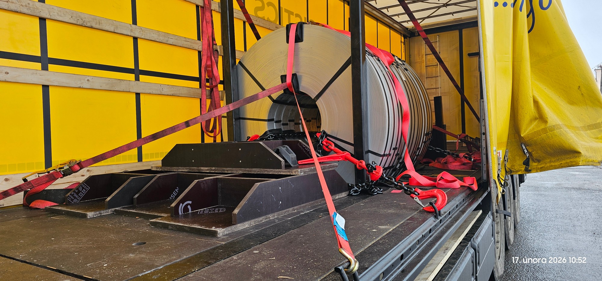 Svitky válcovaného ocelového pásu přepravujeme v návěsech s integrovanou vanou (muldou).